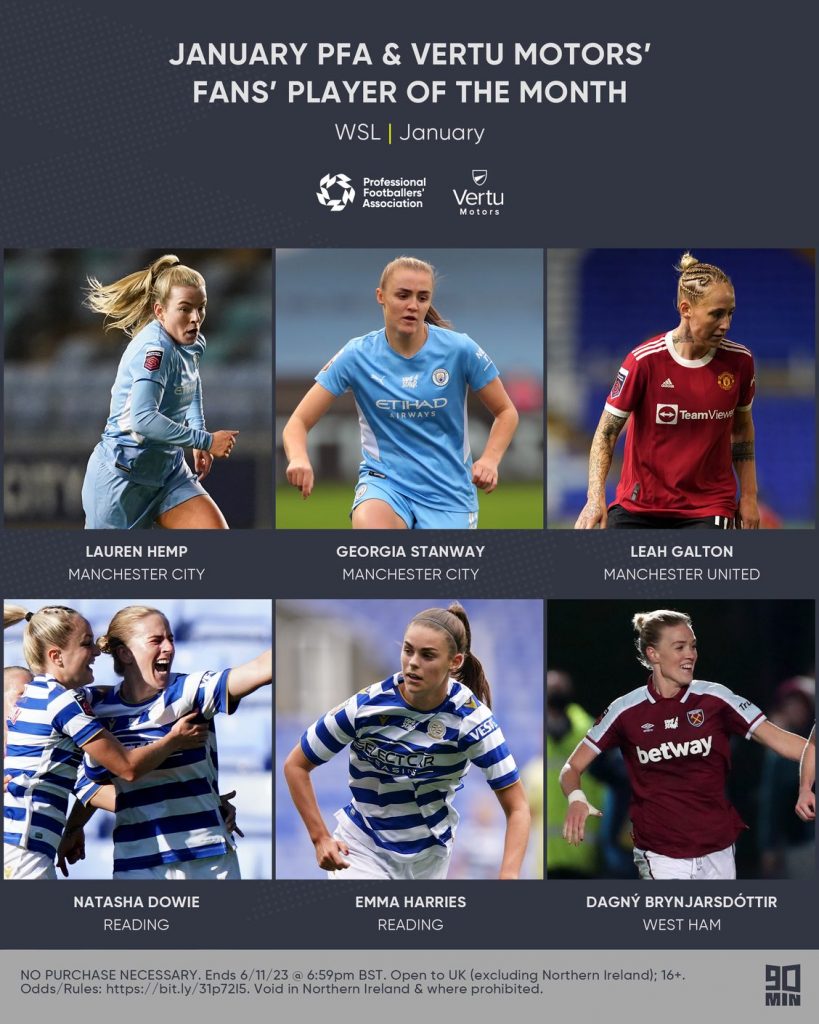 Man City’s English duo Stanway and Hemp linked up on multiple occasions in big victories for the back to form Citizens, while Harries and Dowie excelled for Reading and also make the shortlist.